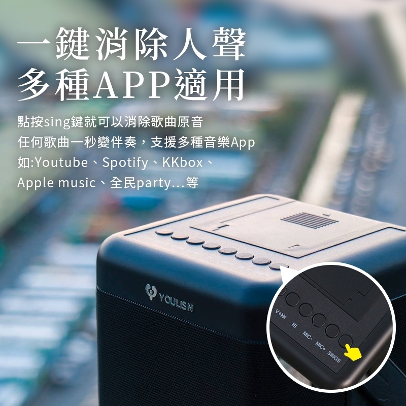 • 一鍵消除人聲(支援Youtube,Spotify,KKbox...等音樂軟體)