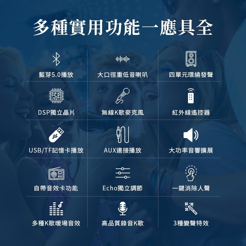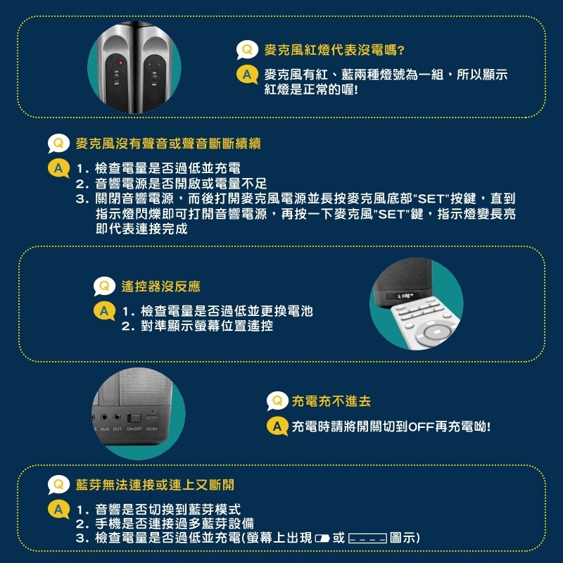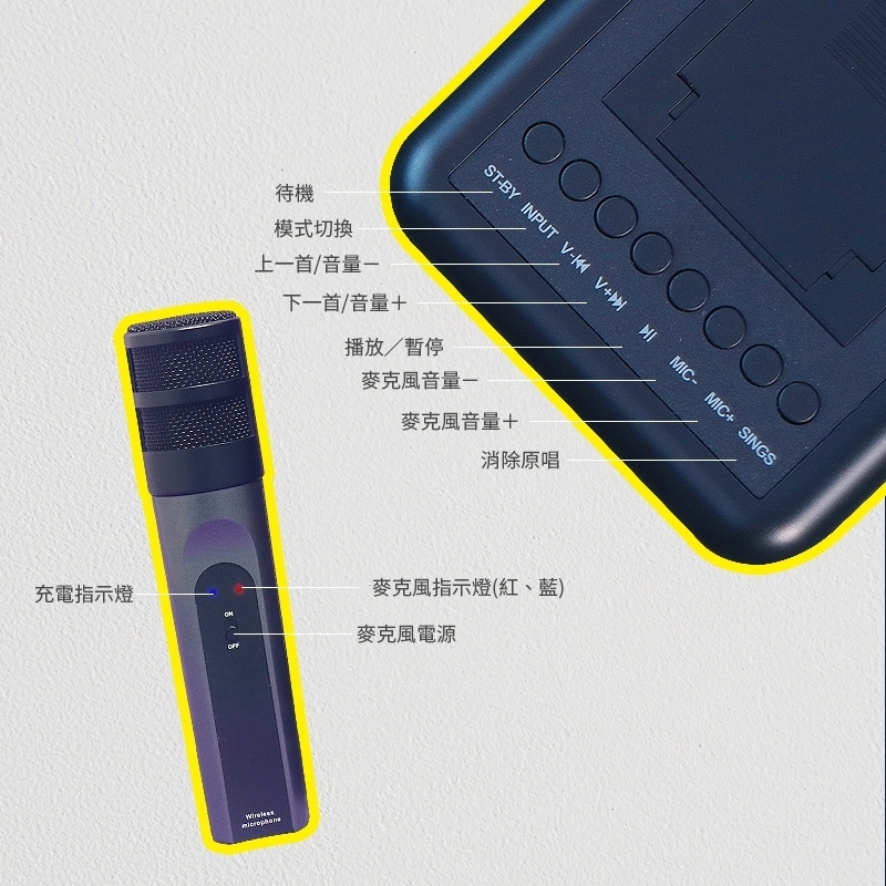 • 使用遙控器可無線調整音樂音量、麥克風音量、Echo等多種功能